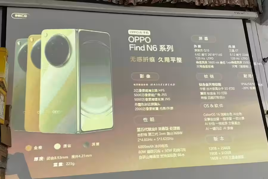 Согласно опубликованной информации, внешний экран Find N6 может получить диагональ 6,62 дюйма и разрешение 1.5K+. Предположительно используется панель BOE Q10 с поддержкой стандартов Dolby Vision, HDR Vivid и HDR10+. Также говорится о применении LTPO-матрицы 8T с адаптивной частотой обновления от 1 до 120 Гц.