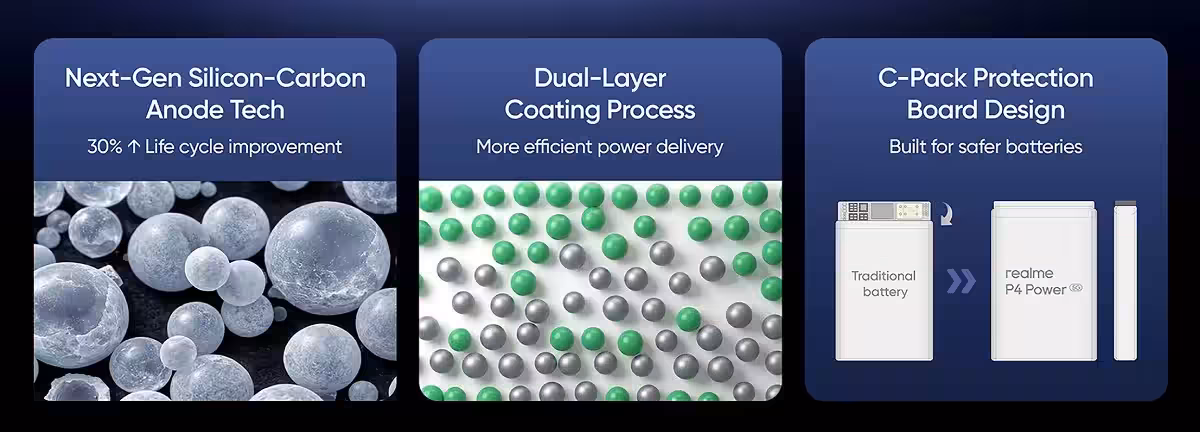В основе устройства — аккумулятор нового поколения на основе кремний-углеродной технологии (Si-C). Realme заявляет, что батарея сохранит не менее 80% первоначальной ёмкости даже после 8 лет использования и рассчитана на 1 650 циклов зарядки.