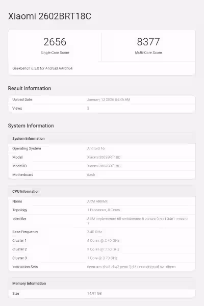 Смартфон Redmi Turbo 5 Pro Max появился в базе Geekbench с ещё не анонсированным процессором MediaTek. Устройство показало 2 656 баллов в одноядерном тесте и 8 377 баллов в многоядерном, а запуск серии Turbo 5 Max ожидается уже в январе. Суббренд Redmi готовится представить линейку Turbo 5 Max до конца месяца. В преддверии анонса в Geekbench был замечен смартфон с модельным номером 2602BRT18C. По имеющимся данным, он относится к будущей модели Redmi Turbo 5 Pro Max.