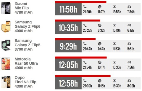 По общему результату среднее время работы Xiaomi Mix Flip превысило показатели Samsung Galaxy Z Flip6 и Galaxy Z Flip5, однако уступило OPPO Find N3 Flip и Motorola Razr 50 Ultra.