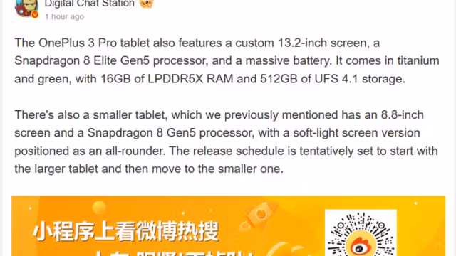 Ранее ожидались два планшета на 8,8 и 12 дюймов с процессором Snapdragon 8 Gen 5 и батареей на 12 000 мА·ч, но новая информация от Digital Chat Station добавляет в портфолио топовую модель Pro. Она может получить до 16 ГБ оперативной памяти LPDDR5X и 512 ГБ внутреннего накопителя UFS 4.1, что ставит её в ряд устройств премиум-класса.