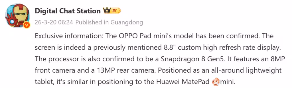 По данным проверенного инсайдера Digital Chat Station, Oppo Pad Mini сохранит тонкий и лёгкий корпус, предлагая при этом качественный дисплей с высокой частотой обновления. Внешне и по позиционированию он будет похож на Huawei MatePad mini — премиальный компактный планшет.