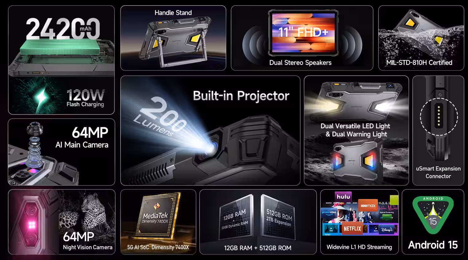 Планшеты работают на базе чипсета MediaTek Dimensity 7400X 5G, что делает их самыми быстрыми и мощными защищёнными устройствами Ulefone. Они работают на Android 15 и обеспечивают стабильную работу даже в экстремальных условиях. Планшеты ориентированы на профессионалов, путешественников и любителей активного отдыха, сочетая производительность, автономность и прочность.