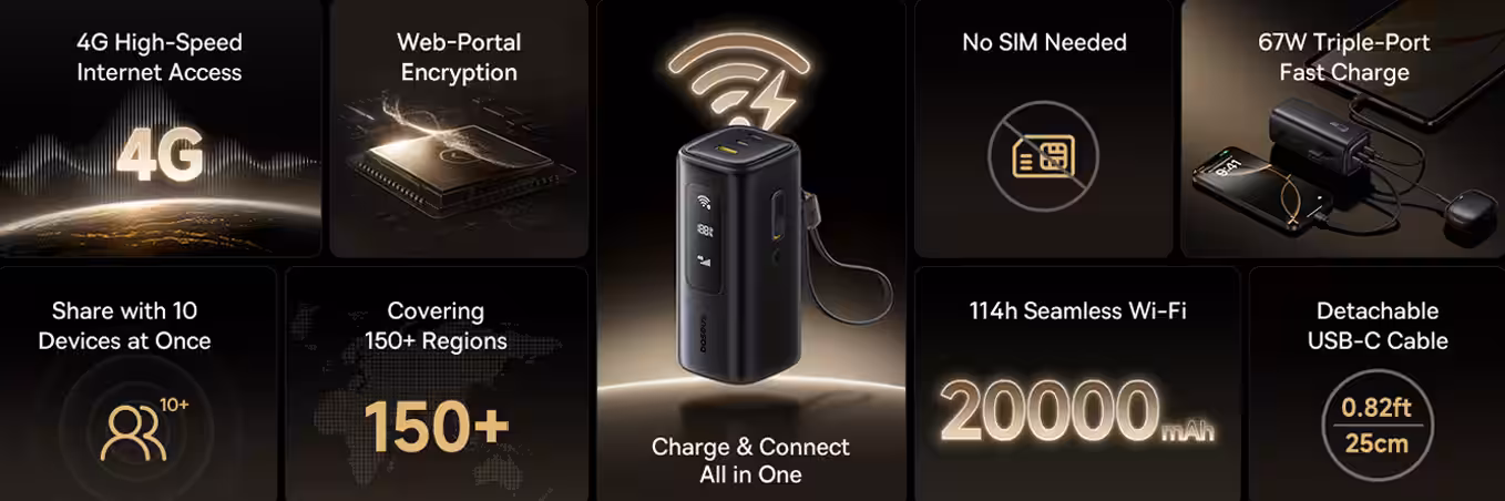 Baseus анонсировала новое гибридное устройство EnerGeek GX11 4G MiFi Power Bank — первый в мире портативный аккумулятор, совмещающий в себе мощный блок питания на 20 000 мА·ч, быструю зарядку мощностью 67 Вт и встроенный 4G-хотспот.