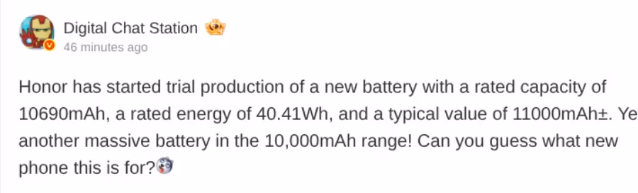 Согласно утечке от инсайдера Digital Chat Station, компания уже начала пробное производство новой батареи с номинальной ёмкостью 10 690 мАч и типичным значением около 11 000 мАч. Название устройства пока не раскрывается, однако речь, вероятно, идёт о новом смартфоне Honor с акцентом на максимальную автономность.