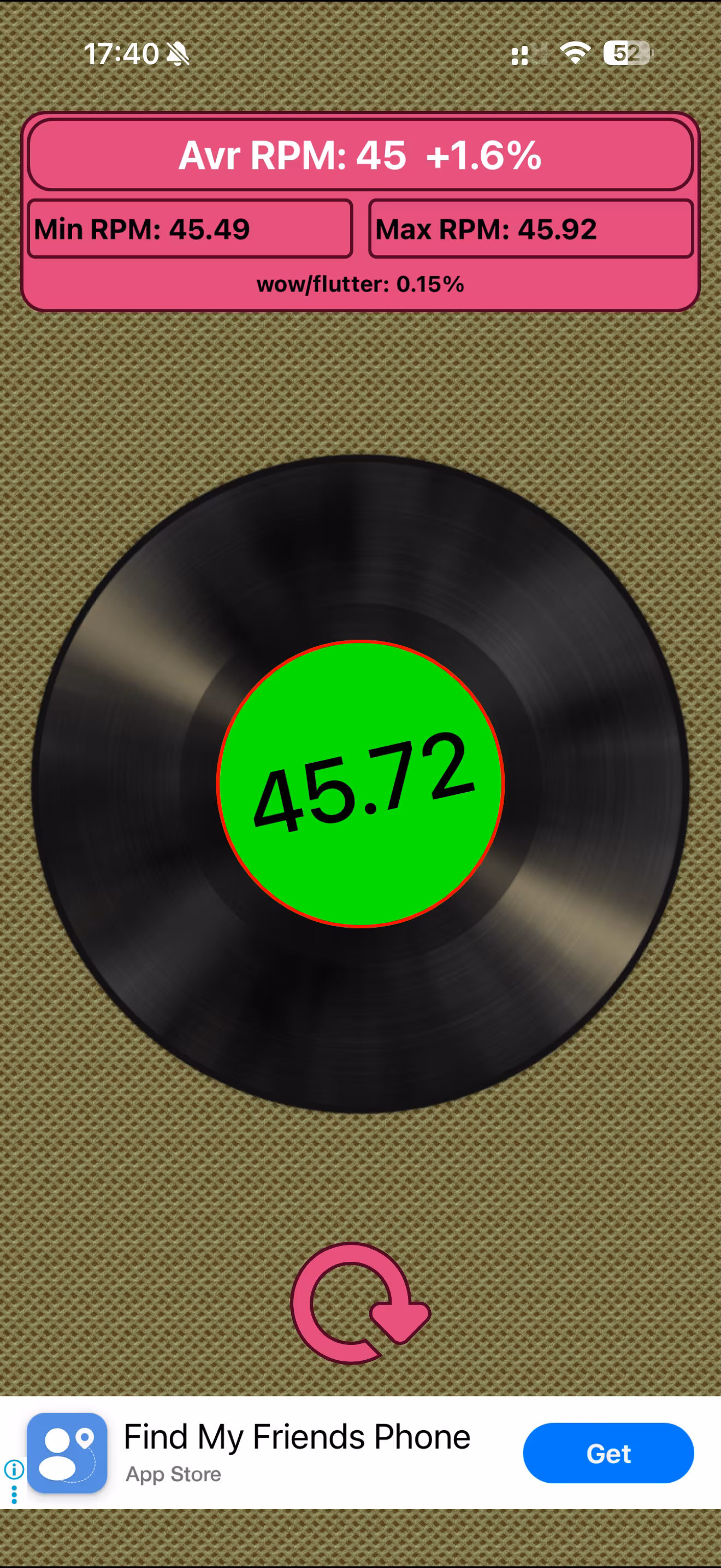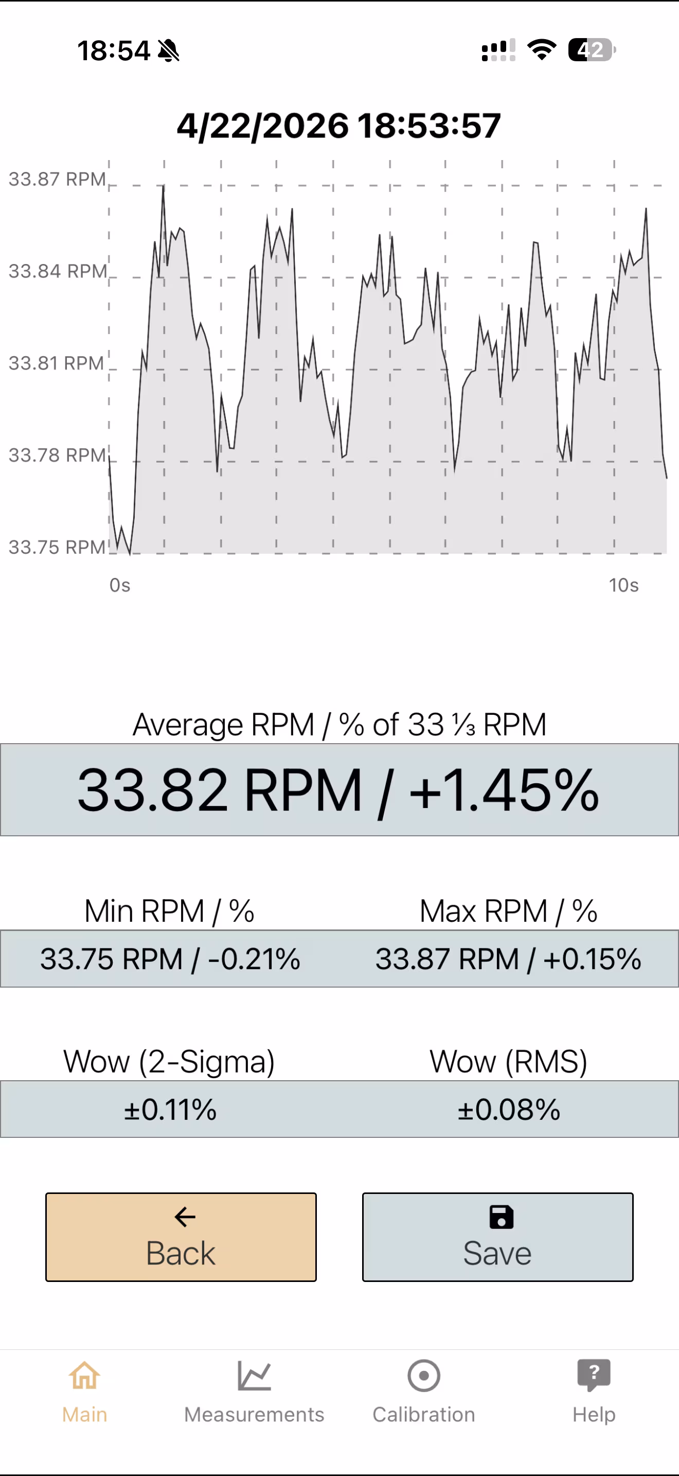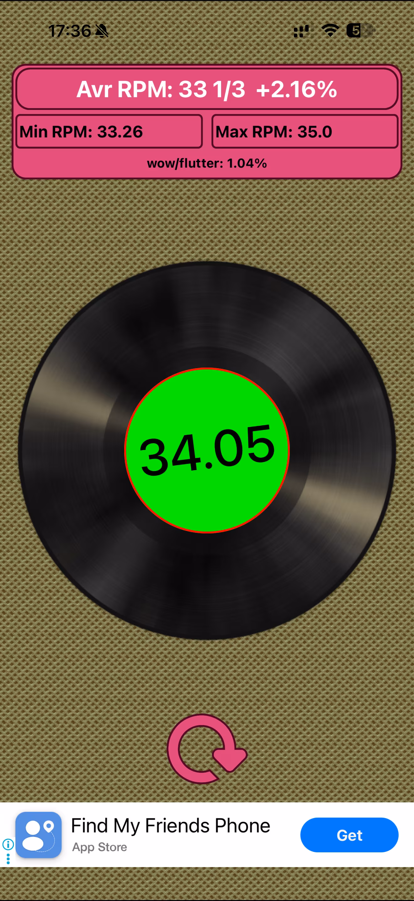 Что касается мотора, то как и сказал в начале, привод тут пассиковый. То есть, мотор подключён через ремень, который и вращает стол с пластинкой. Из коробки скорость на обоих режимах чуть-чуть убегает вперёд.По замерам в режиме 33 об/мин средняя скорость составила 33,99 RPM, отклонение от номинала +1,96%. На 45 об/мин: 45,61 RPM, отклонение +1,35%. Проблема решается штатным триммером под корпусом за пару минут: два потенциометра-подстроечника, по одному на каждую скорость. Надо лишь покрутить маленькой плоской отвёрткой, пока приложение для теста скорости не покажет номинал, потом даёшь мотору прогреться минуту и проверяешь ещё раз.