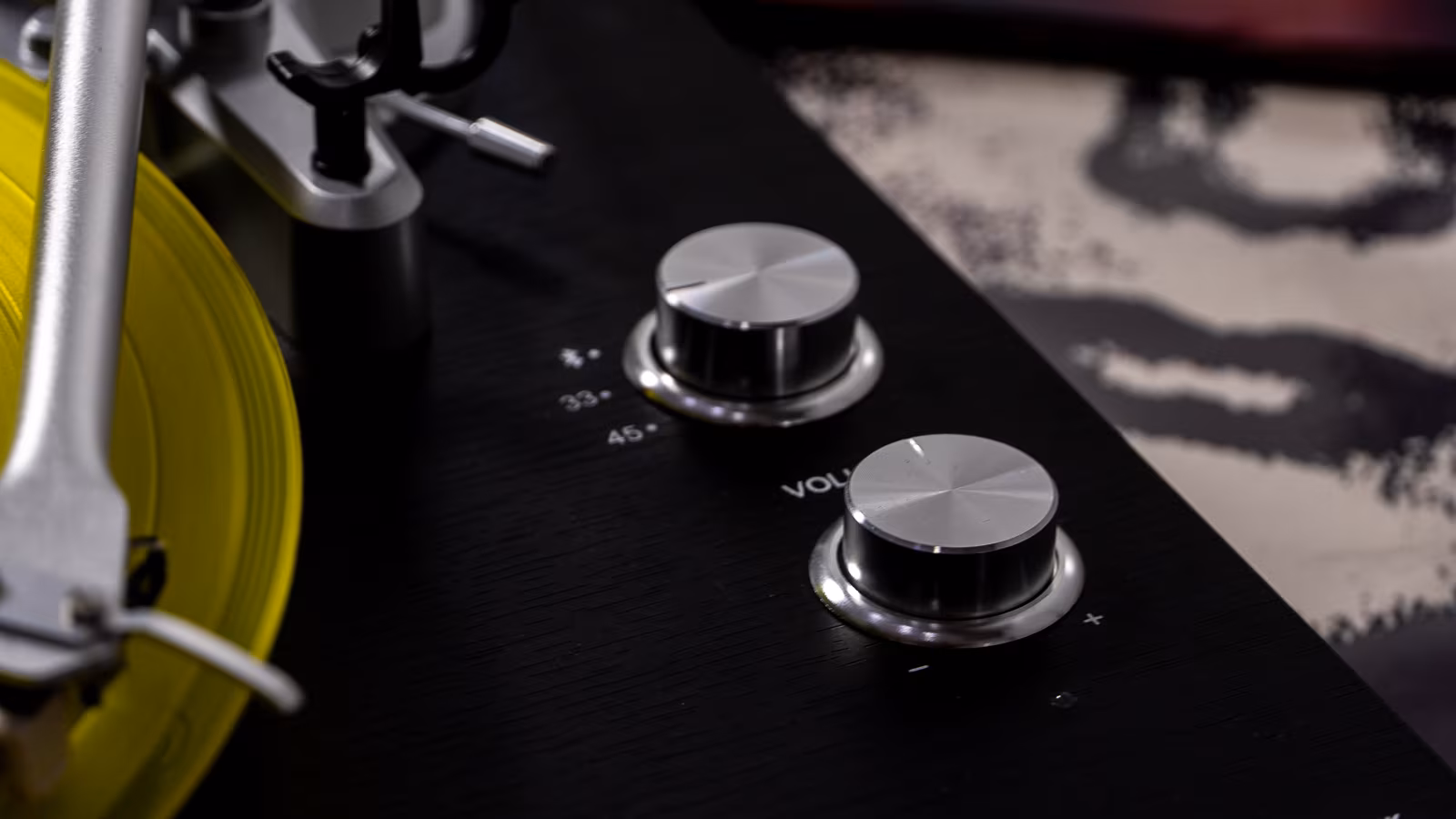 Из приятного хочу отметить наличие микролифта. Рычаг расположен в правой нижней части стола, рядом с поворотными регуляторами скорости и громкости. Он обеспечивает плавное опускание и подъём тонарма без рывков. Это важно: резкое касание иглы о пластинку изнашивает и картридж, и канавку. Вращение диска при этом устроено толково: двигатель запускается, когда тонарм перемещается к пластинке, и останавливается, когда тот возвращается на подставку. Не нужно отдельно включать и выключать мотор каждый раз.