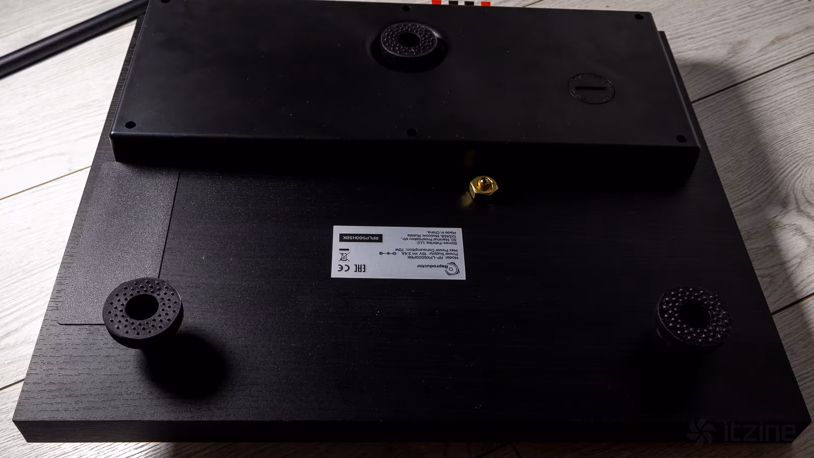 Снизу у проигрывателя три массивные резиновые ножки для того, чтобы гасить вибрацию и отверстие для регулировки скорости (можно тонкой отвёрткой аккуратно покрутить потенциометры в движке, но если не умеете, лучше не браться). Некоторые могут подумать, что это странное решение сделать 3 ножки вместо 4. Однако, достаточно вспомнить школьную физику и опыт, когда стулья и столы на 4 ногах качаются и приходится что-то подкладывать. Тогда как на трёх ногах, т.к. это минимальное количество точек для стабильной опоры, ничего качаться не может в принципе. В общем, решение отличное, но вопросы у меня всё равно появились. Очень не хватило настройки высоты ножек. К сожалению, не всегда есть возможность найти абсолютно ровную поверхность, у которой нет наклона. И регулировка положения ножек здесь бы очень помогла, а в итоге придётся обходиться подручными материалами.