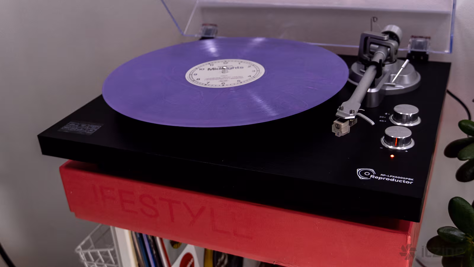 Виниловый проигрыватель Reproductor RP-LPX500SPBK стоит от 34 990 рублей и поставляется с парой колонок: никаких дополнительных покупок, комплект готов к работе после распаковки: покупай пластинку и включай. Это продукт российского бренда Reproductor, основанного в 2024 году. Внутри: пассиковый привод, предустановленный картридж Audio-Technica AT3600L, переключаемый встроенный фонокорректор и Bluetooth 5.0 для стриминга со смартфона. Аудиофилу, конечно же, будет мало, но тому, кто покупает первую вертушку и не хочет разбираться в совместимости компонентов, подойдёт отлично.