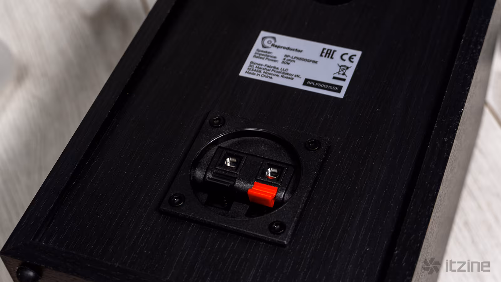 Колонки RPLPX500G4BK двухполосные пассивные, подключаются стандартными проводами, так что при желании можно купить подлиннее или укоротить в домашних условиях Корпус из МДФ толщиной 10 мм. В каждой: 4-дюймовый вуфер с бумажным диффузором и резиновым подвесом, 1-дюймовый купольный твитер, фазоинвертор с портом 29 мм сзади, разделительный фильтр первого порядка с неполярным конденсатором. Мощность каждой: 30 Вт, суммарная: 60 Вт. Встроенный усилитель проигрывателя выдаёт 18 Вт на канал.