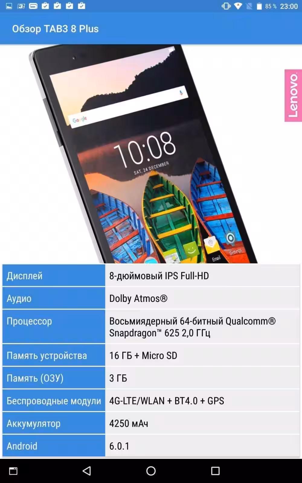 С точки зрения начинки Lenovo Tab3 8 Plus может похвастаться средними показателями — без overkill, но с достаточными мощами для работы. Это восьмиядерный Qualcomm Snapdragon 625, видеоядро Adreno 506, 3 ГБ ОЗУ и 16 ГБ ПЗУ, из коробки доступно всего 10, остальное занято системой Android 6.0.1. К тому же, есть возможность поставить карту памяти формата microSD. Питает это всё дело аккумулятор ёмкостью 4250 мАч.