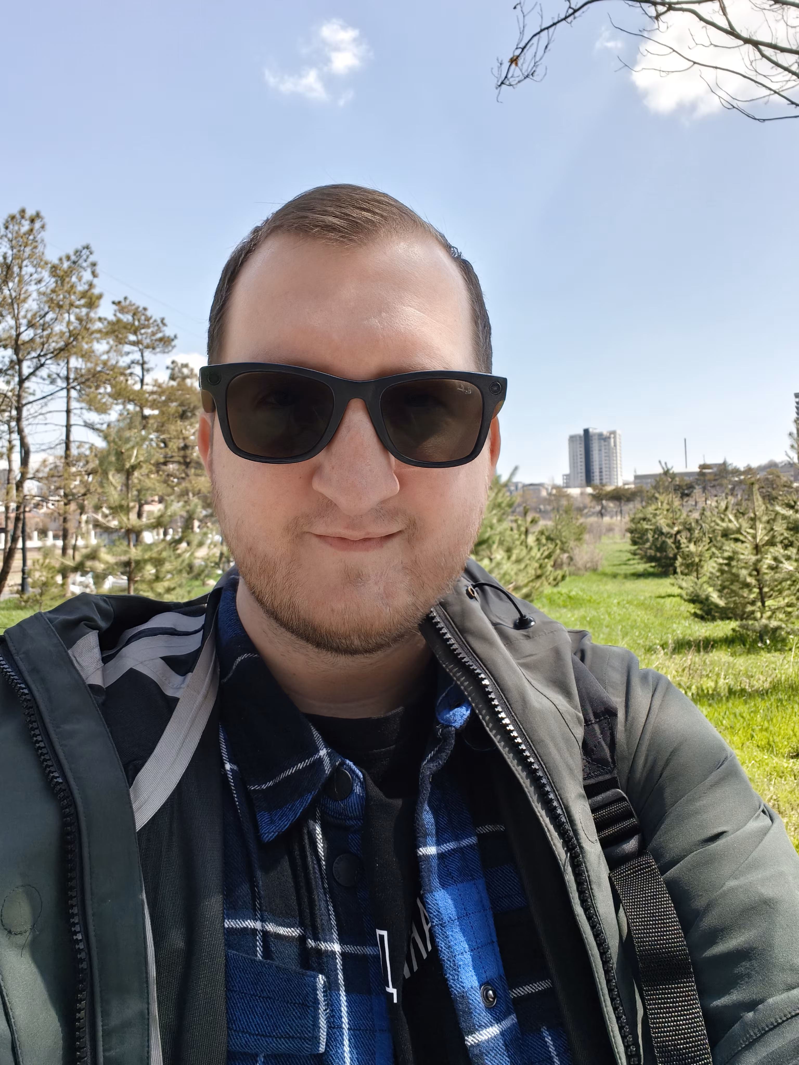Фронтальная камера 50 Мп, диафрагма f/2.4, эквивалентное фокусное 22 мм, фокус фиксированный. На стандартных дистанциях для селфи это не проблема, но если хочешь снять что-то ближе 40 сантиметров, уже не получится (хотя представить такой сценарий странно). При хорошем свете результат достойный: чёткость высокая, динамический диапазон широкий. Цвета чуть-чуть бледноваты, хотя возможно я привык к смартфонам со встроенным агрессивным бьютификатором. Оттенки кожи при этом точные, без красного или жёлтого уклона. Алгоритм сглаживания кожи работает по умолчанию, но не агрессивно: по умолчанию обработка вменяемая на мой взгляд. Главное, что его можно полностью отключить в настройках.