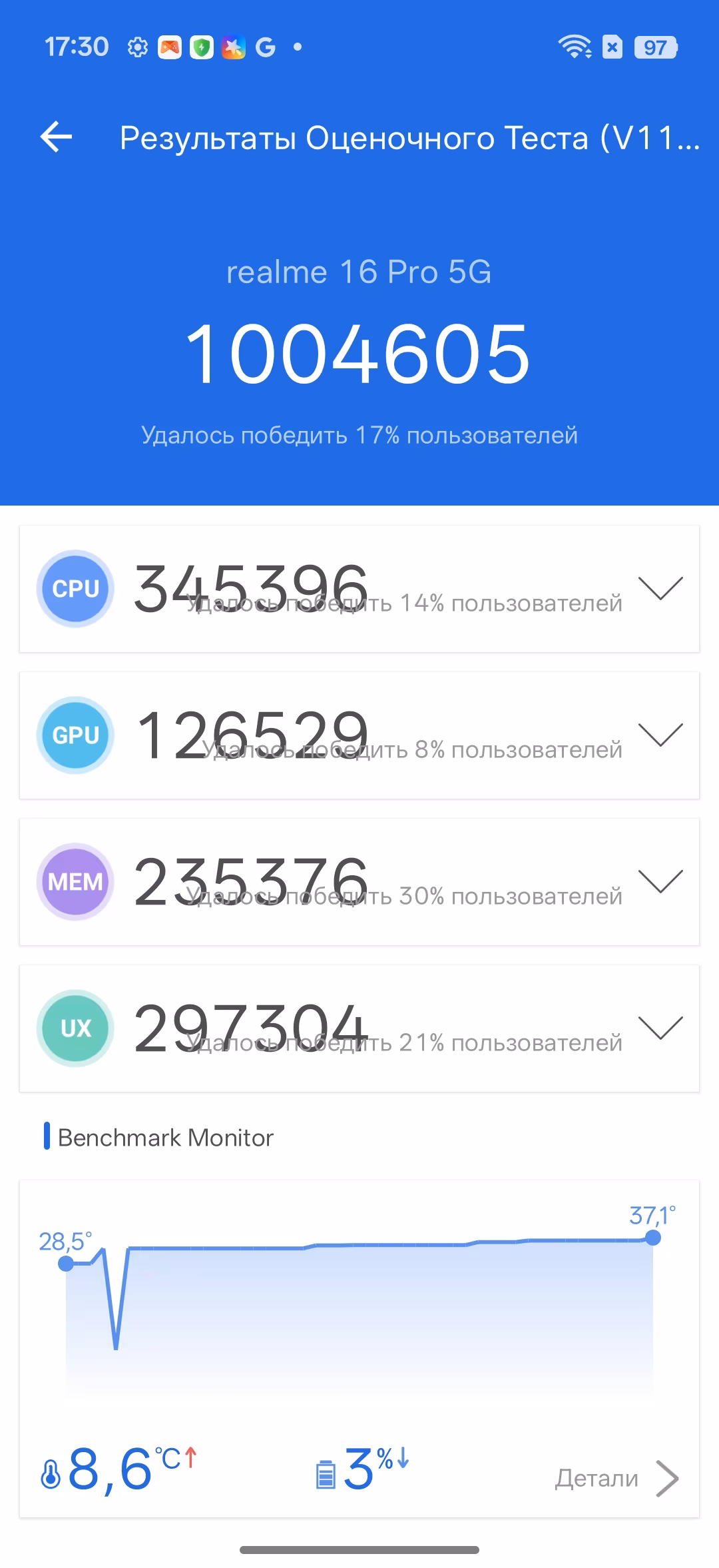 Провёл полный набор тестов на реальном аппарате (Build ID RMX5120, Android 16, апрель 2026). Начнём с самого показательного 3DMark Wild Life Extreme Stress Test: лучший цикл 863 балла, худший 857, устойчивость 99,3%. Двадцать циклов подряд — и чип не просел ни разу, график выглядит как ровная линия. Это значит, что тротлинг отсутствует. Телефон не снижает производительность под нагрузкой и работает ровно так же в первую минуту, как и в двадцатую. Нагрев за весь тест составил 8,6 °C, пик температуры корпуса 37,1 °C. Это неплохо для смартфона под стресс-тестом, обычно гаджеты греются сильнее.
