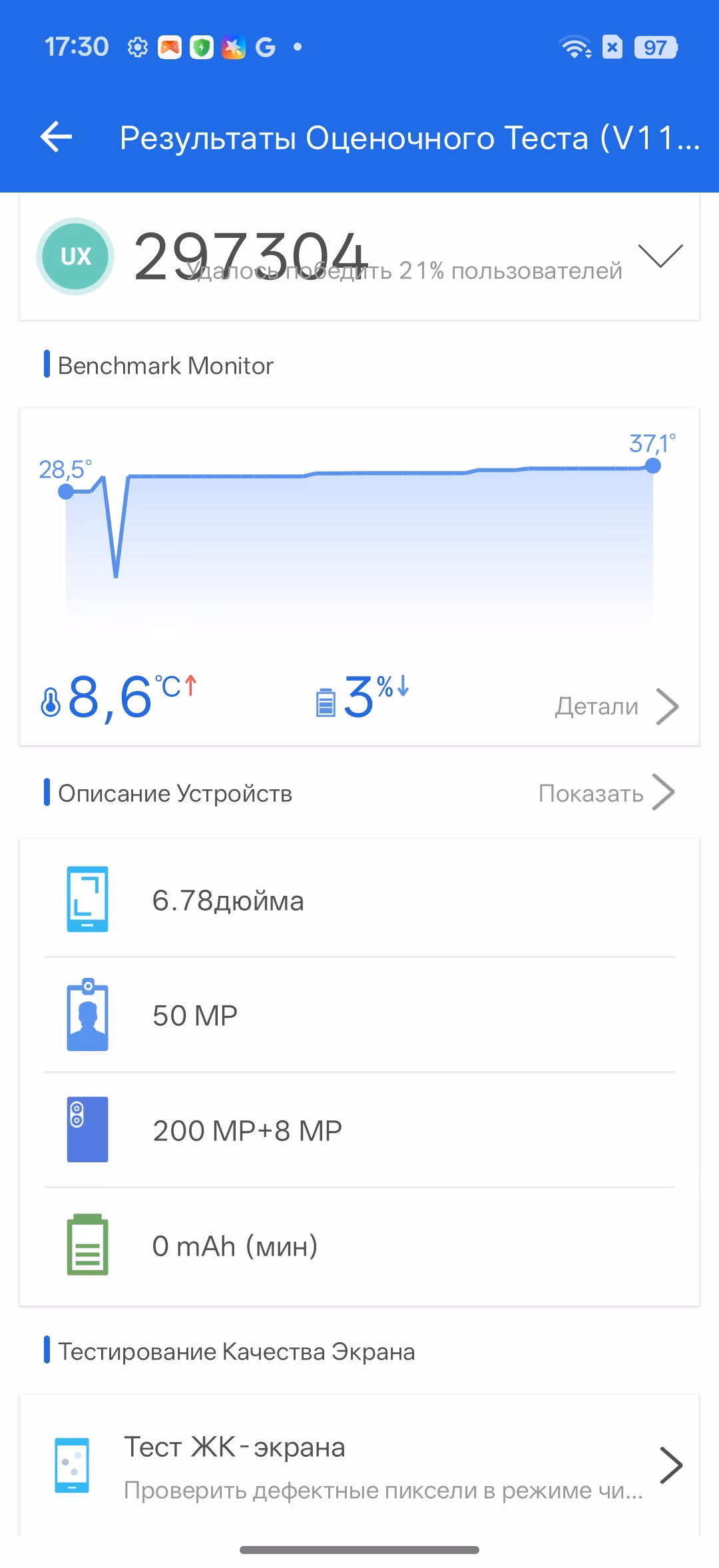 AnTuTu UX-тест зафиксировал 1 004 605 баллов, что довольно неплохо для смартфона среднего сегмента. Причём из них 297 304 балла — это оценка интерфейсной отзывчивости. Результат выше 21% пользователей. Не рекорд, но интерфейс на деле ощущается живым: анимации плавные, приложения открываются без паузы, зависаний за пару недель теста я не встретил.