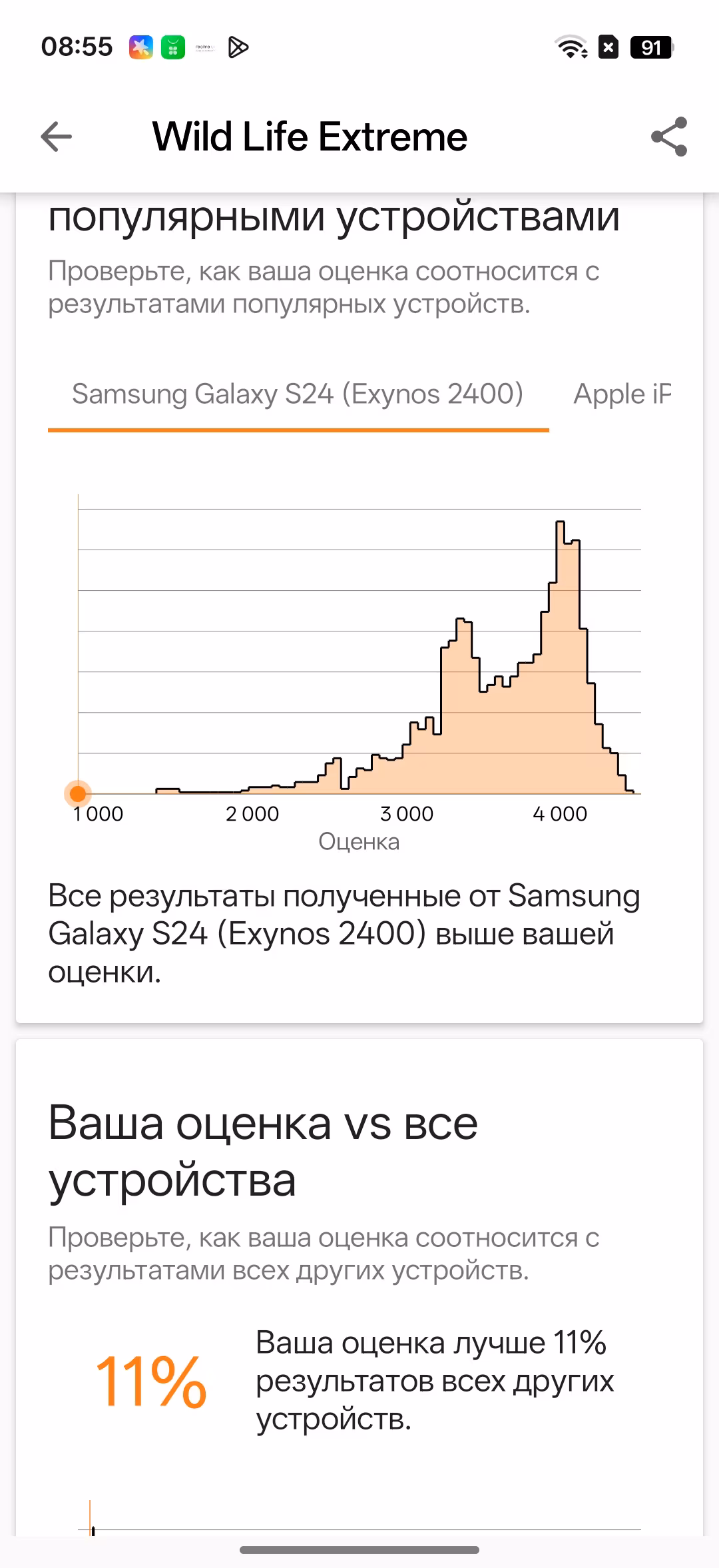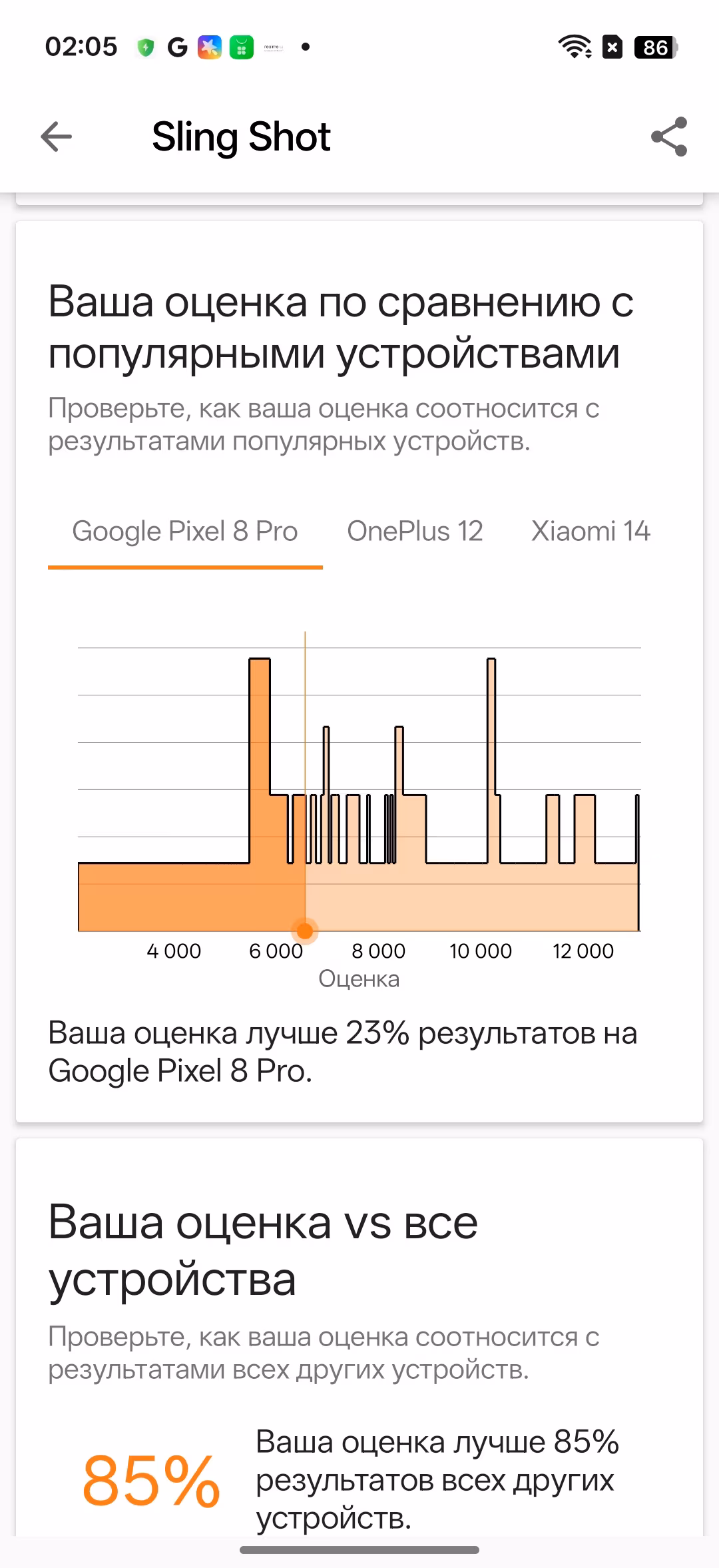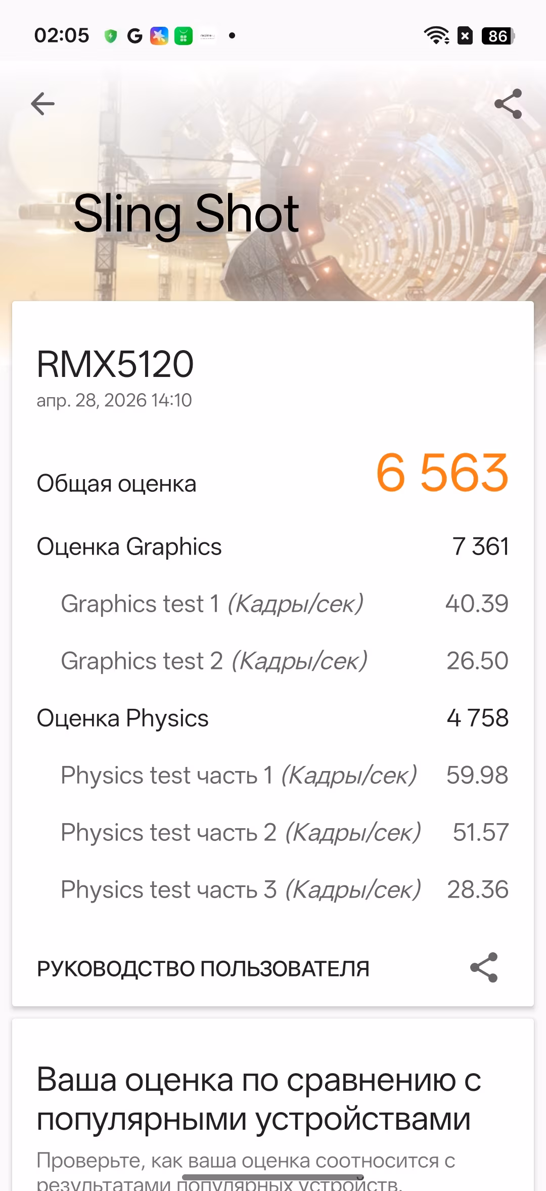 3DMark Wild Life Extreme (разовый прогон): 865 баллов, 5,19 fps. Это тяжёлый тест, и 865 баллов — нижняя часть турнирной таблицы: лучше только 11% всех устройств в базе 3DMark. Честно? Ожидаемо. Dimensity 7300-Max не строился под 3D-графику. 3DMark Wild Life (стандартный): 3 183 балла, 19,06 fps — уже лучше 35% всех устройств. 3DMark Sling Shot: 6 563 балла (Graphics 7 361, Physics 4 758) — лучше 85% устройств в базе. Это уже приятная цифра: в OpenGL ES 3.1 телефон выступает в середине рынка, а не в хвосте, выдавая даже 40-60 кадров в секунду.