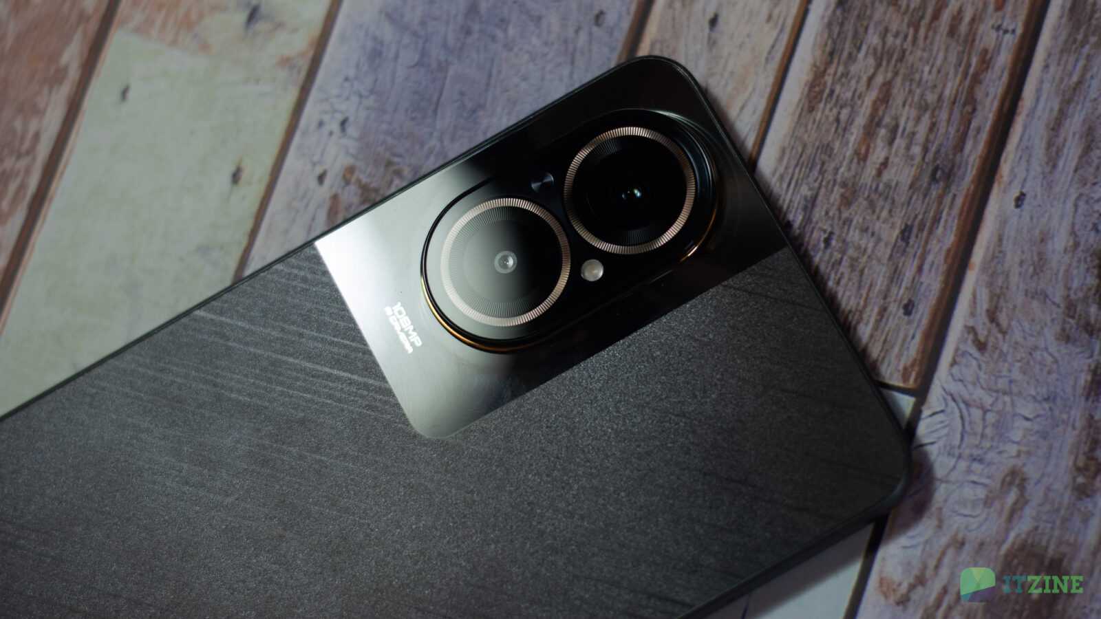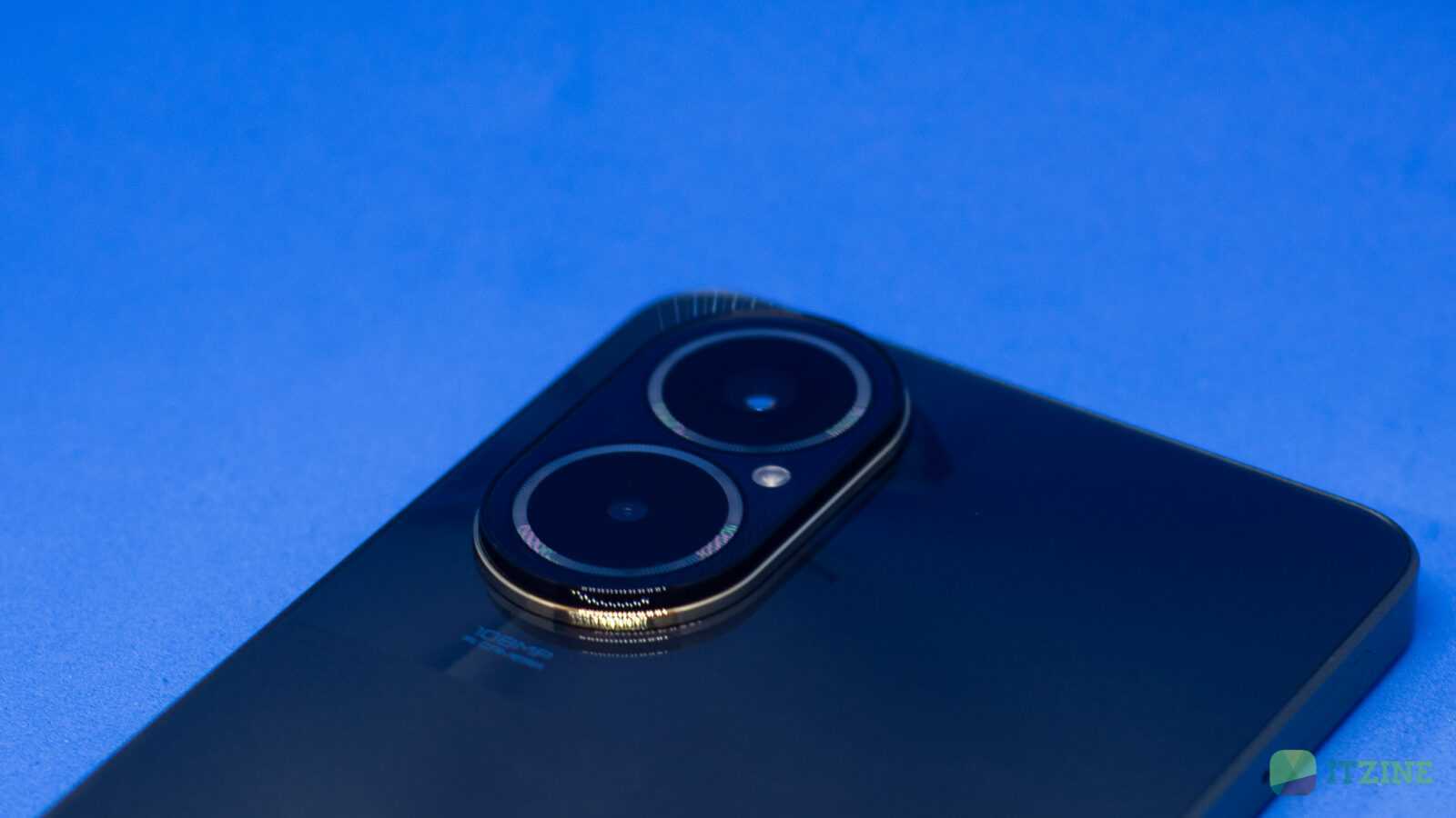 Блок камер, расположенный в верхнем левом углу, выделен зеркальным покрытием с радиальными «лучами», окружающими модули. Под ними вы можете увидеть основные характеристики – 108 Мп ИИ-камера. Самы модули камер размещены на относительно высоком овальном «пьедестале» и имеют серебристый край, так же как и оба модуля. Конечно, здесь не забыли и о вспышке. Несмотря на то что сенсоры относительно небольшие, им было выделено достаточно места – это современный тренд.