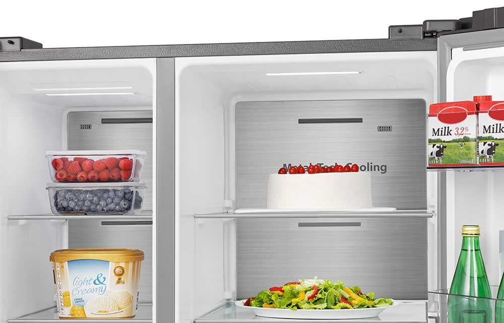 Сердце холодильника – инверторный компрессор, который обеспечивает стабильность температуры, высокий уровень энергоэффективности и долгий срок службы. Он работает бесшумно и анализирует условия внутри холодильника, чтобы, опираясь на эти данные, регулировать мощность охлаждения. Технология Metal Cooling отвечает за равномерное распределение холода во всех отсеках, которое достигается за счет металлического покрытия задней стенки холодильника. Это особенно важно при частом открывании дверцы.