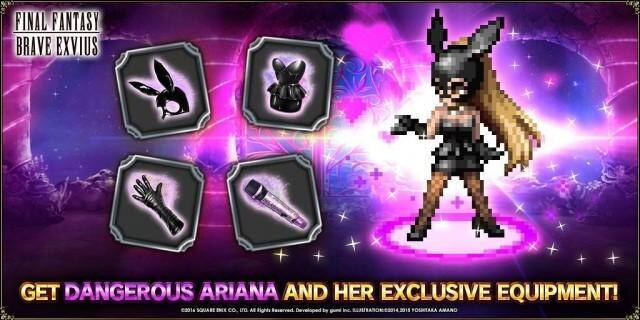 В рамках эксклюзивного сотрудничества американской исполнительницы с издателем Square Enix в популярной action-RPG-серии появился персонаж, выполненный по образу самой Арианы. Так, аватар Гранде носил латексную маску «кролика», отсылая к обложке альбома Dangerous Woman. Кроме того, поп-дива даже сделал озвучку для героини. Персонаж с несколькими вариантами нарядов могла присоединиться к команде искателей приключений. После ошеломительного успеха в игру добавили и Кэти Перри, которая в честь коллаборации даже выпустила музыкальный клип. В промо-трейлере к внутриигровому дополнению показано, как во время выступления Кэти происходит некий сбой, из-за которого она вместе со своей собакой превращается в пиксельного персонажа Final Fantasy Brave Exvius. Создатели игры и стилисты Перри подобрали для поп-королевы искрящееся роскошное платье, в котором она вместе с игроками готова бороться с монстрами в опасных подземельях, зарабатывать монетки и очки опыта.