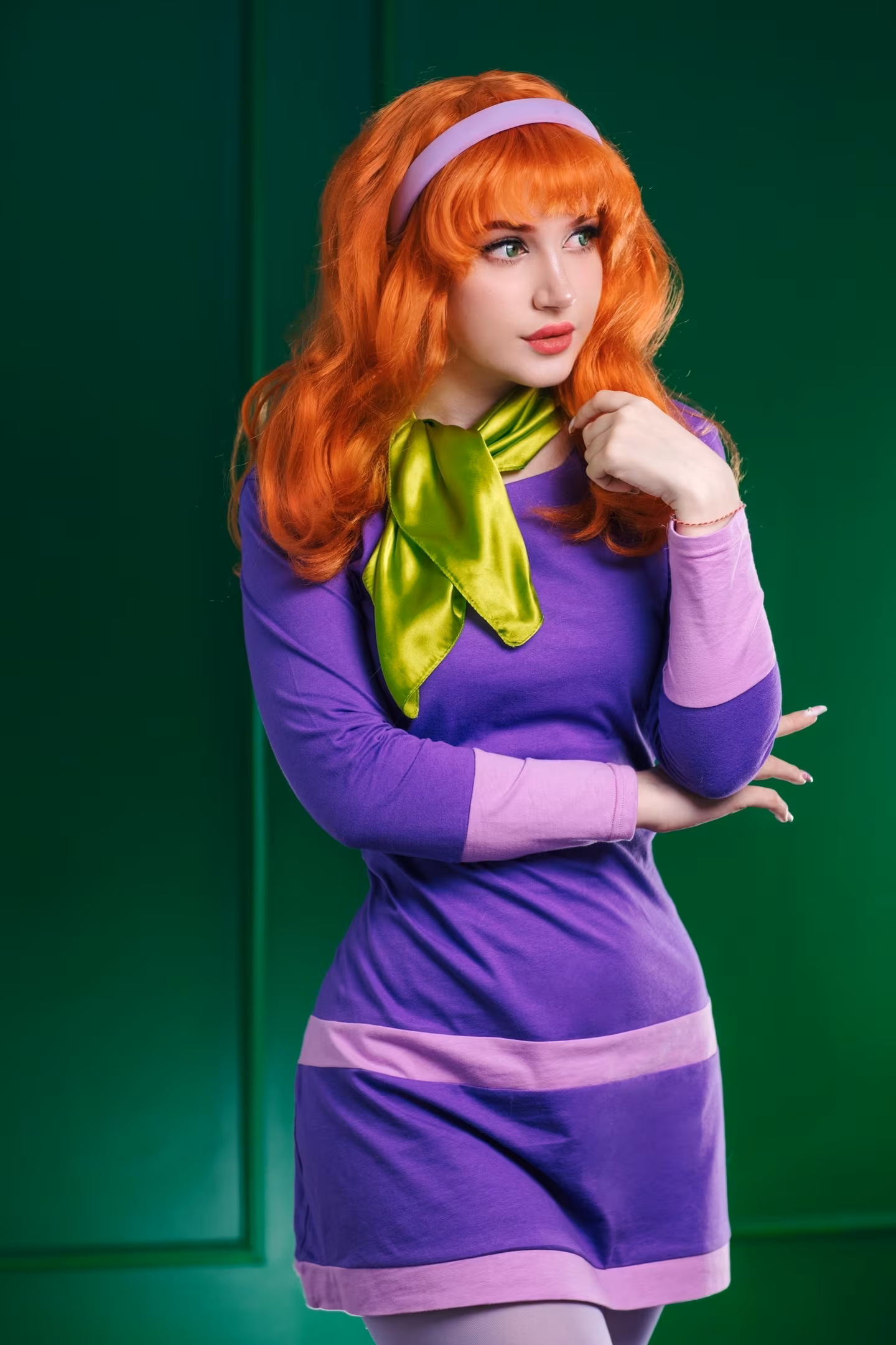 Косплеерша Ulichan представила образ Дафны Блейк из мультсериала «Скуби-Ду, где ты?» — с точностью до последней детали: рыжий парик с чёлкой, фиолетовое платье с сиреневой окантовкой, салатовый шарф и лиловая повязка на голове.