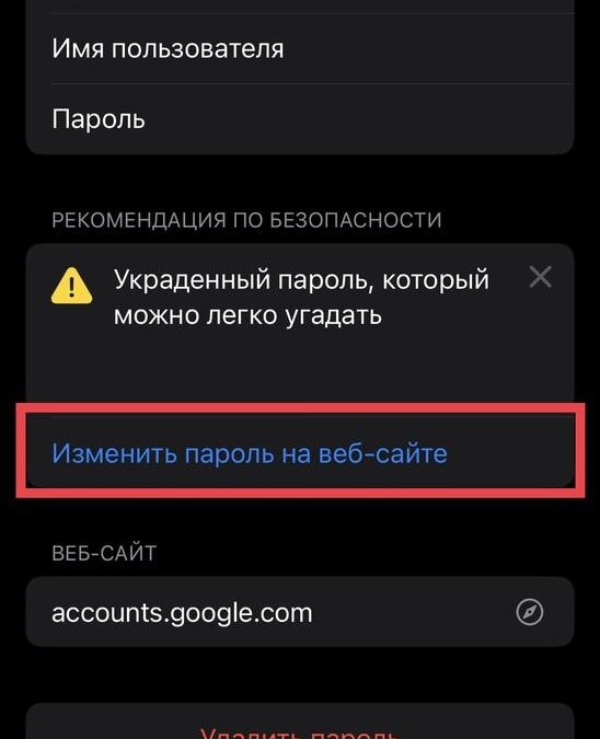 Если есть какие-либо украденные пароли, iPhone сообщит, какие пароли следует изменить. Предупреждение укажет, почему вы должны изменит пароль. Например, если вы повторно используете пароль для нескольких учетных записей, Apple предложит изменить его на что-то уникальное. Кроме того, оповещение сообщит, фигурировал ли пароль в утечках данных. Такое предупреждение означает, что вы должны изменить его как можно скорее.