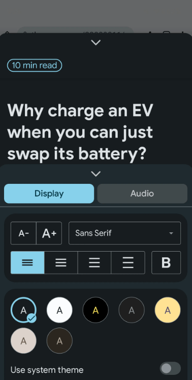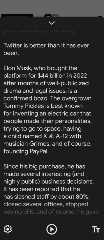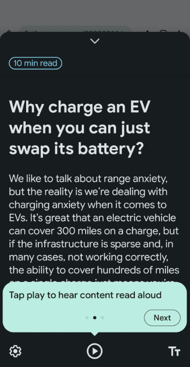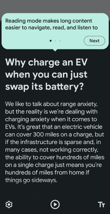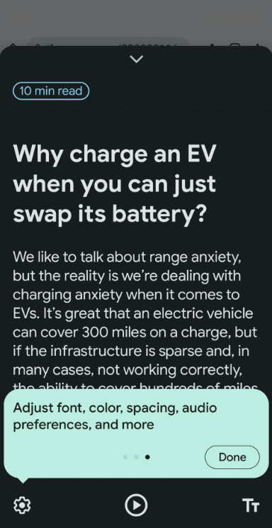 - При первом использовании режима чтения оно познакомит вас с функциями и настройками. Нажатие на шестеренку в левом нижнем углу открывает параметры настройки текста и звука, а кнопка в правом нижнем углу дает быстрый доступ к настройке размера шрифта. Нажмите кнопку воспроизведения посередине, чтобы активировать воспроизведение аудио. Коснитесь над панелью «Режим чтения» или просто проведите по ней сверху вниз, и она скроется, открыв содержимое, находящееся под ней.