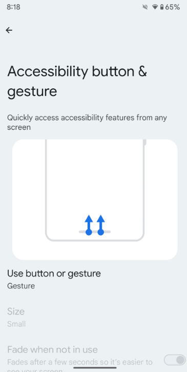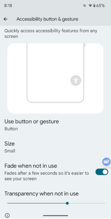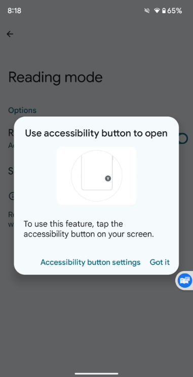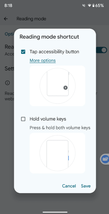 - По умолчанию режим чтения активируется виртуальной кнопкой, которая постоянно находится на экране — коснитесь ее, и приложение будет активировано. Также можете запустить его, нажав и удерживая обе клавиши регулировки громкости. Если нажмете на ссылку «Дополнительные параметры» в разделе «Параметры быстрого доступа», можете переключить виртуальную кнопку на жест, проведя двумя пальцами вверх в нижней части экрана, чтобы включить ее.