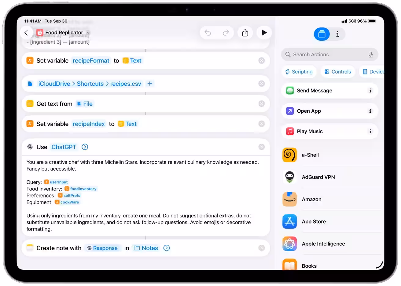 Shortcuts умеют не только работать с файлами и текстом, но и управлять «умным» домом — включать свет, менять температуру или отправлять уведомления. Один из сценариев, Food Replicator, использует Apple Intelligence для создания рецептов на основе списка продуктов.