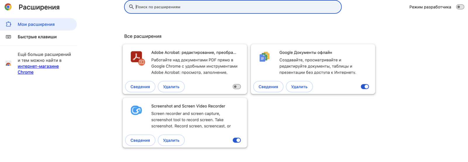 - Отключите ненужные расширения, нажав на тумблер в правом нижнем углу каждого из них.
