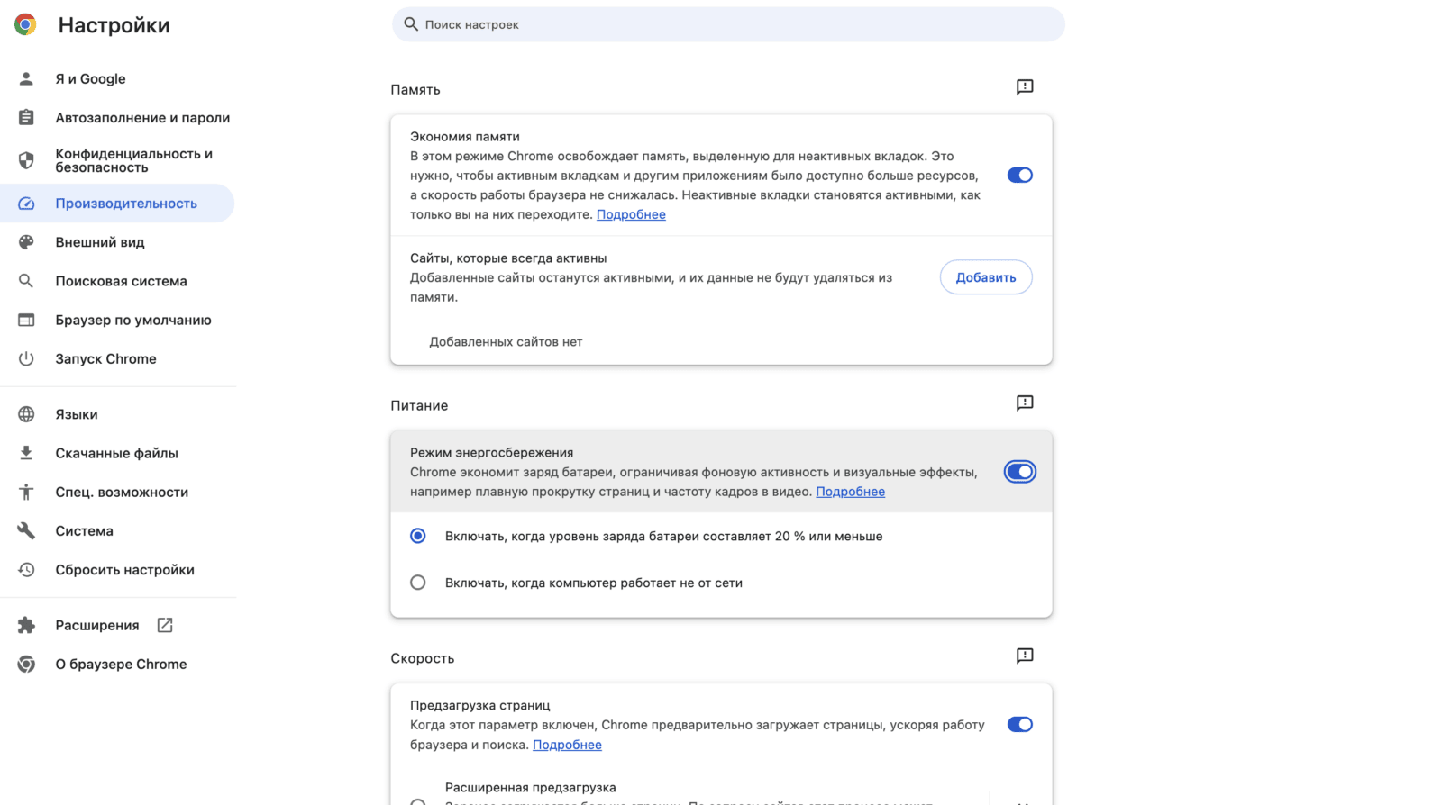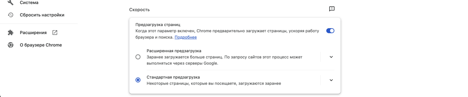 - Прокрутите страницу вниз до блока «Скорость» и включите или выключите предварительную загрузку страниц.