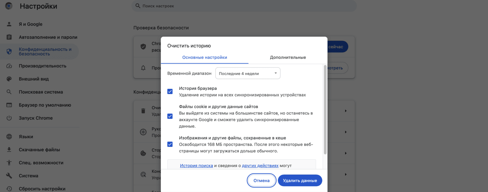 Google Chrome предупреждает, что некоторые сайты могут загружаться медленно при следующем посещении, но это временно. Со временем работа браузера ускорится. Кроме того, с помощью этой функции можно удалить и другие сохраненные данные, включая историю просмотров и файлы cookie. Если вы перейдете на вкладку «Дополнительно», вы также сможете удалить такие файлы, как пароли, настройки сайтов и данные размещенных приложений.