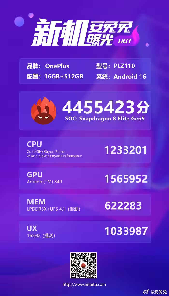 OnePlus 15T показал почти 4,5 млн баллов в AnTuTu — чуть ниже iQOO 15 Ultra